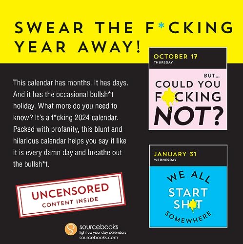 Keep it real, blow off some steam, and give zero f*cks all year with a 2024 daily swearing calendar! With 365 days of hilarious profanity and bold, designed pages, this irreverent and motivational day-by-day calendar is the perfect humorous desk calendar, sarcastic gift for women, men, or friends, funny white elephant gag gift for adults, or holiday stocking stuffer for any foul-mouthed friend. Keep for yourself or give the best f*cking gift this year!