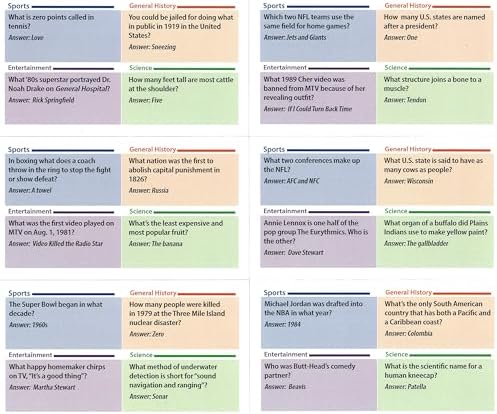 The deck of cards contains 300 general knowledge questions. Each card is divided into four categories: Entertainment, Sports, General History and Science.