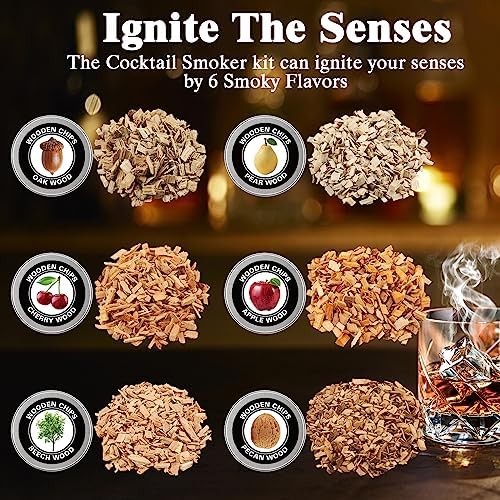 【6 Smoky Flavors】 The drink smoker infuser kit comes with apple, cherry, oak, beech, pear, and pecan wood chips. You can infuse your manhattans, whisky, cocktail, bourbon sours with that rich, sweet, fruity smoke.