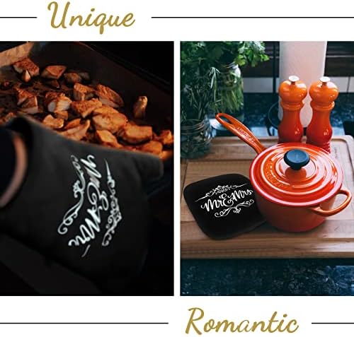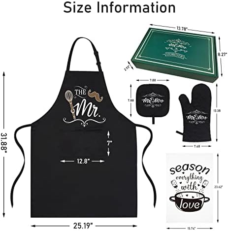 1pc Black Mr Apron1pc Black Mrs Apron1pr Black Over Mitts1pc Black Pot Holder1pc White Kitchen TowelAll packed in green gift box
